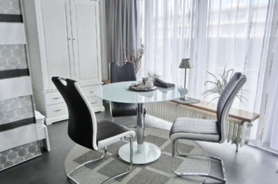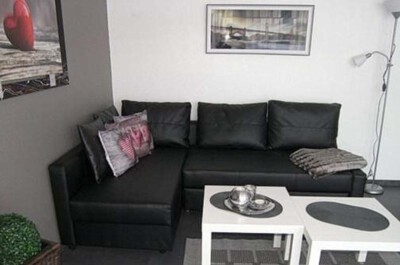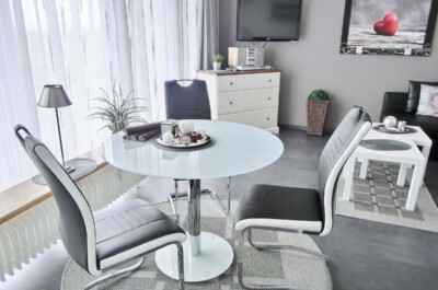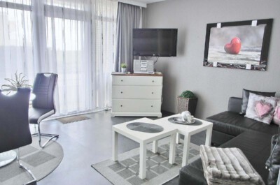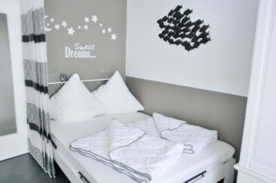Wohn- / Schlafzimmer: Helles, modern eingerichtetes Wohn/Schlafzimmer mit Laminatboden und direkten Zugang zum Balkon in östliche Richtung. Etwas verdeckt hinter der Tür befindet sich ein Doppelbett (Größe: 140×200 cm) und ein Kleiderschrank. Im Wohnbereich: eine Schlafcouch, Couchtisch, Essplatz für 3 Personen. Zur Unterhaltung steht ein Flachbildschirm, eine kleine Stereoanlage zur Verfügung. Das Fenster ist mit Verdunklungsgardinen versehen. Bettwäsche und Handtücher sind mitzubringen oder mietbar