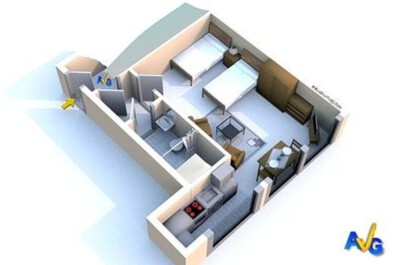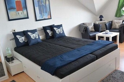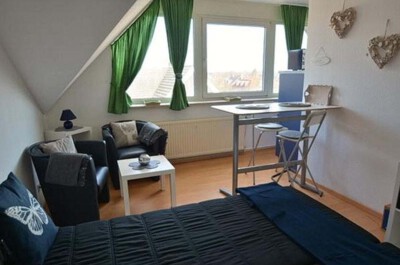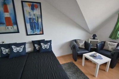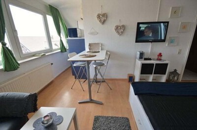 Wohn-/ Schlafzimmer: Helles, modern eingerichtetes Wohn- / Schlafzimmer mit Aussicht auf die Kirchenstrasse und teilweise über die Dächer von Grömitz. Das Wohn- und Esszimmer ist mit einer kleinen Essecke, 2 Schlafliegen, 2 Sessel und einem Kleiderschrank ausgestattet. Dei Wohnung ist mit Laminat-Fussboden ausgelegt. Eine Ministereoanlage mit CD, ein DVD-Player, und ein Kabel TV-Gerät sorgen für Unterhaltung.
