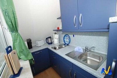Küche: Moderne, komplett eingerichtete kleine Pantryküche mit 2 Flammen E-Herd, Kühlschrank, Mikrowelle, Wasserkocher und Toaster.