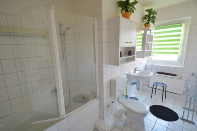 Bad: Modernes, geräumiges, freundliches Tageslichtbad mit WC, Waschbecken und Badewanne mit Duschtrennwand.