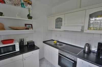 Küche: Grosse, komplett eingerichtete separate Einbauküche mit Fenster. Die Küche ist ausgestattet mit einer Spülmaschine, 4-Platten E-Herd mit Backofen, großer separater Gefriertruhe, Kaffeemaschine, Mikrowelle, Wasserkocher, Eierkocher, Toaster.