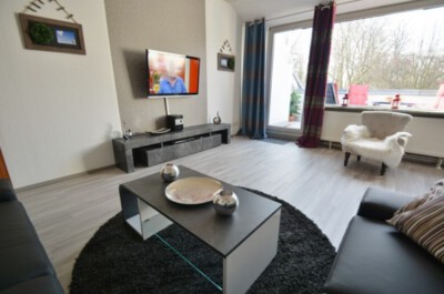 Wohnzimmer: Helles, freundliches modern eingerichtetes Wohn- und Esszimmer mit direktem Zugang zum Balkon. Das Wohn- und Esszimmer ist mit einem Essplatz für 5 Personen, einer Schlafcouch, einem Couchtisch, Ministereoanlage mit CD-Player, Fernseher und DVD-Player ausgestattet. Das Wohn- und Esszimmer ist mit Teppichboden ausgelegt.