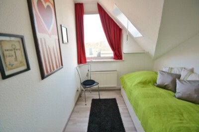 Kinderzimmer: Das Kinderzimmer ist mit zwei Betten Doppelbett (je 90 x 200 cm) und einem kleinenKleiderschrank ausgestattet. Das Kinderzimmer ist mit Teppichboden ausgelegt. Die Fenster lassen sich durch eine Blickdichte Gardine bzw. das Dachfenster durch einen Rollo verdunkeln.