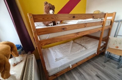 Kinderzimmer: Separater Kinderschlafraum mit Stockbett. Das Fenster lässt sich blickdicht verdunkeln