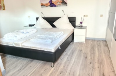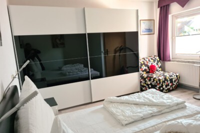 Schlafzimmer: Großes Schlafzimmer mit Doppelbett (Größe: 2x90x200cm) und großem Kleiderschrank. 2 Nachtische, Das Fenster lässt sich blickdicht verdunkeln. Vinylboden. Bettwäsche und Handtücher sind mitzubringen oder mietbar
