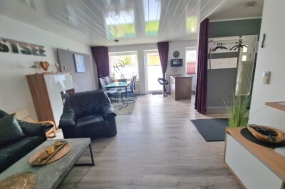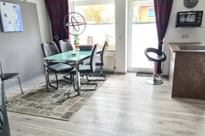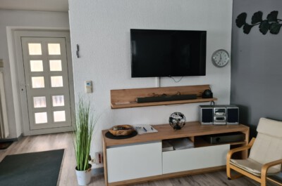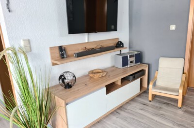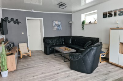 Wohnzimmer: Helles, modern eingerichtetes Wohnzimmer mit Schlafcouch, Radio, Sat-TV, W-Lan, Vinylboden
