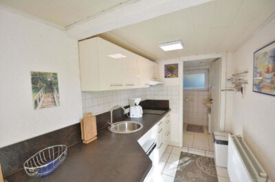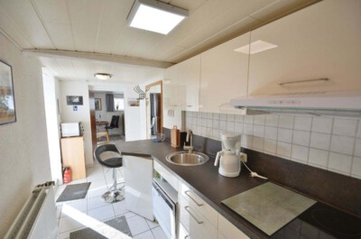Küche: Moderne, komplett eingerichtete Küche mit 4-Platten Ceran Kochfeld , mobiler Backofen, Mikrowelle, kleine Spülmaschine, Kühlschrank mit Tiefkühlfach, Wasserkocher, Toaster