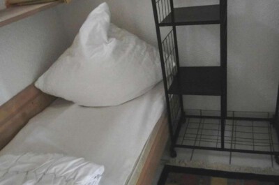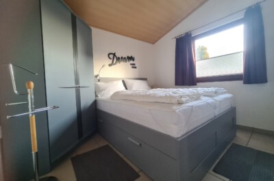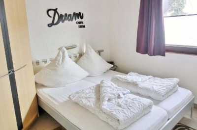 Schlafzimmer: Modernes Schlafzimmer mit Doppelbett. Größe: (2x80x200 cm). Das Fenster lässt sich blickdicht verdunkeln Bettwäsche und Handtücher sind mitzubringen oder mietbar