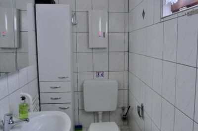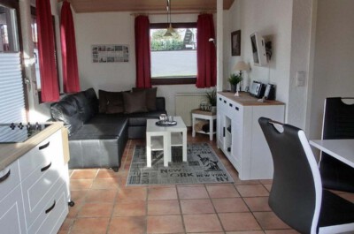 Wohnzimmer: Helles, modern eingerichtetes Wohnzimmer, gefliest, Lederschlafcouch, Couchtisch und Kommode. Zur Unterhaltung gibt es einen Sat-Fernseher, DVD-Player, und kleine Stereoanlage. Weiterhin ist ein Essplatz für 3 Personen vorhanden.