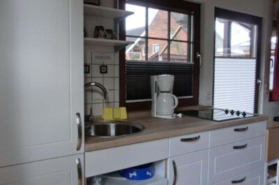 Küche: Moderne, komplett eingerichtete Küche mit 4-Platten Ceran, mobiler Backofen, Mikrowelle, kl. Spülmaschine, Kühlschrank mit Tiefkühlfach, Wasserkocher, Toaster