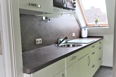 Küche: Komplett eingerichtete Küche mit Spülmaschine, 4-Platten-Cerankochfeld, Kühlschrank mit kleinem Gefrierfach. Des Weiteren stehen eine Kaffeemaschine, ein Toaster, ein Wasserkocher, eine Mikrowelle und ein kleiner Backofen zur Verfügung.