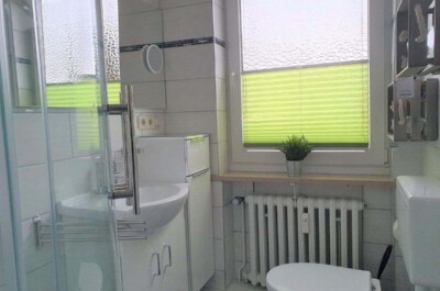 Bad: Modernes helles Tageslichtbad mit Dusche, Waschbecken und WC.
