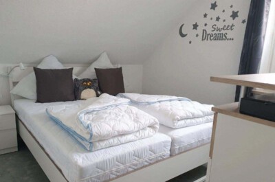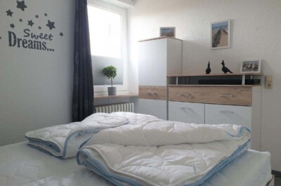 Schlafzimmer: Gemütliches Schlafzimmer mit einem Doppelbett (Größe: 2x80x200 cm) und einem kleinen Kleiderschrank. Der Raum ist mit Vinylboden ausgelegt. Das Fenster lässt sich durch ein Plissee und eine Verdunklungsgardine abdunkeln. Bettwäsche und Handtücher sind mitzubringen oder mietbar