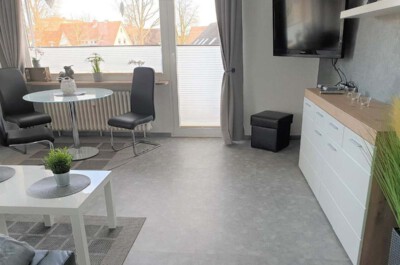 Wohnzimmer: Lichtdurchflutetes Wohnzimmer mit sonnigem Süd-Balkon. Das Zimmer ist ausgestattet mit einer Schlafcouch, einem Couchtisch, einer Kommode und einem Esstisch mit 3 Stühlen. Zur Unterhaltung stehen ein Flachbild-TV (Kabelanschluss) und eine Stereoanlage zur Verfügung. Der Raum ist mit Vinylboden ausgelegt. Die Fenster lassen sich durch Vorhänge verdunkeln